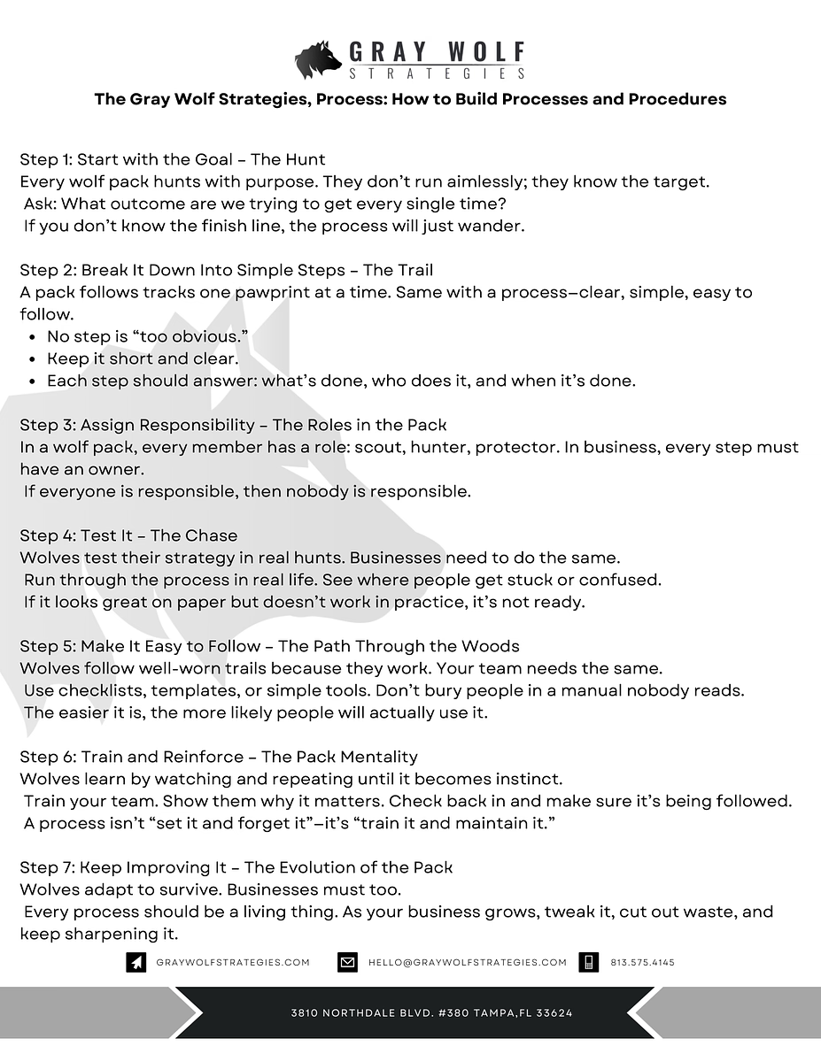 Every great team runs on clear processes. At Gray Wolf, we believe in hunting with purpose, assigning roles, and building systems that drive results. Download our Step-by-Step SOP Framework and start creating processes your team will actually follow.